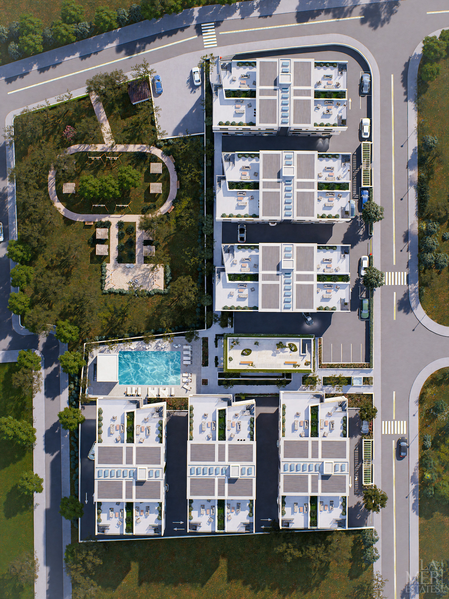 The complex surrounds a lush public park and offers premium amenities at the club house, including a pool, gym, yoga studio, sauna and a roof zen garden.
