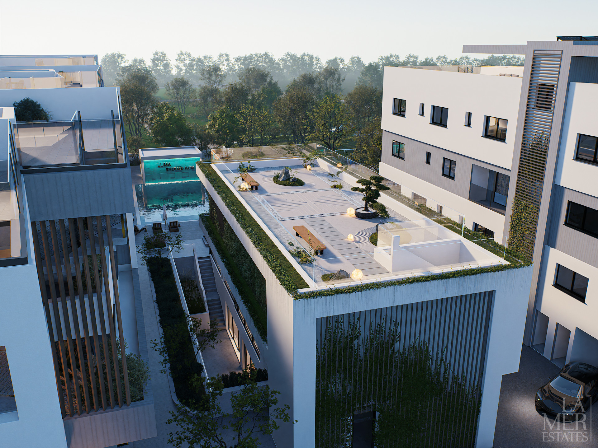 The complex surrounds a lush public park and offers premium amenities at the club house, including a pool, gym, yoga studio, sauna and a roof zen garden.