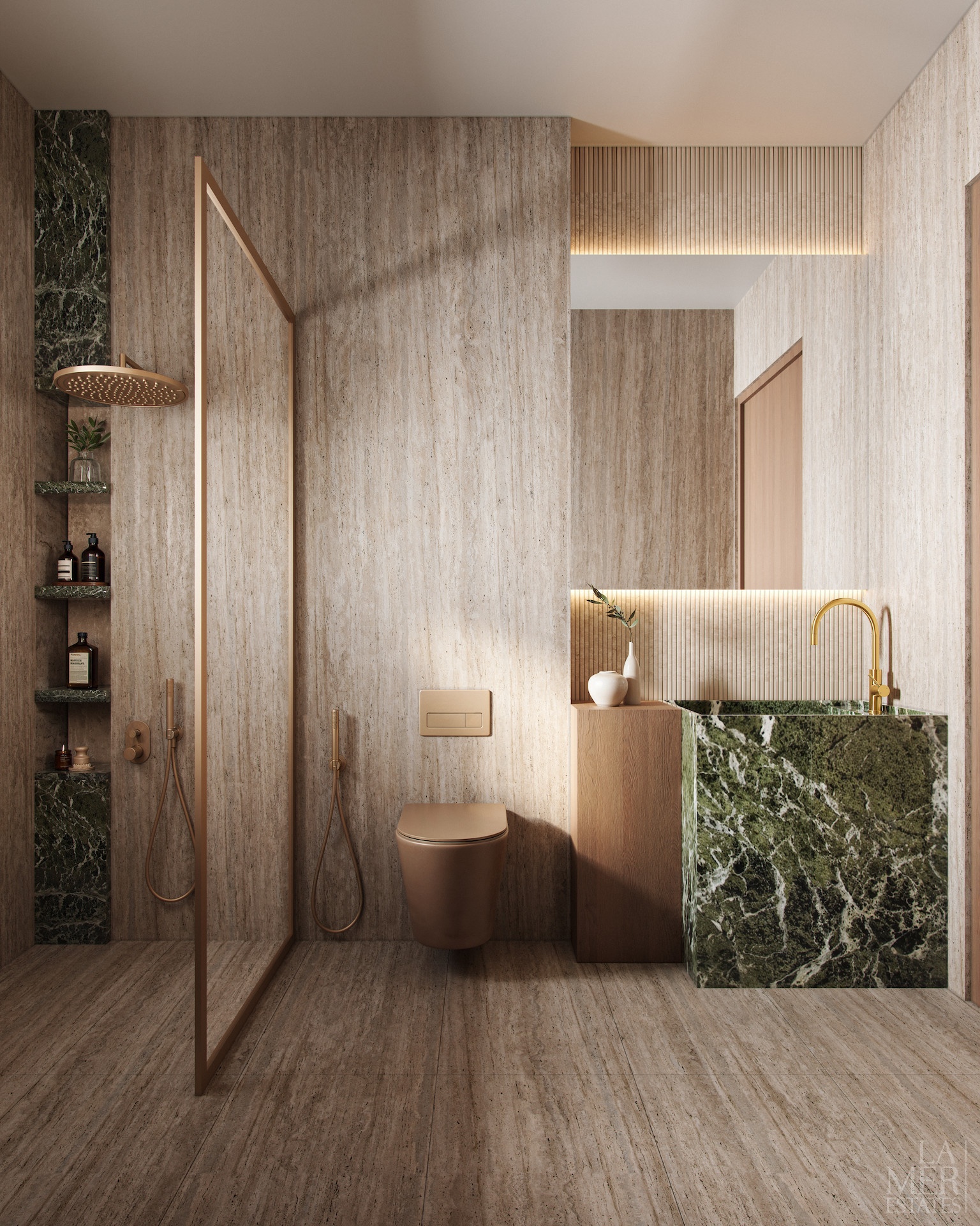 The contemporary exterior harmoniously blends materials and textures, while apartments in earthy tones and minimalist aesthetics feature premium finishes and large windows that flood the spaces with natural light, creating a serene,